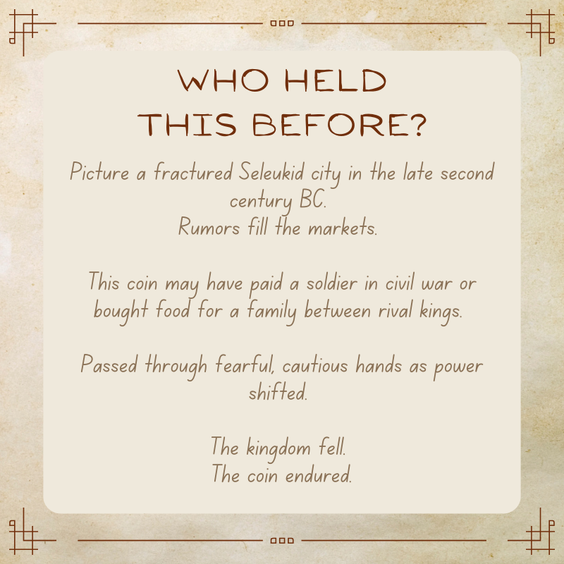 It could have bought food for a family caught between rival rulers, unsure whose laws would rule tomorrow. Perhaps a merchant accepted it cautiously, knowing today’s king could be tomorrow’s enemy. Antiochos IX ruled during chaos, bloodshed, and shifting loyalties.
