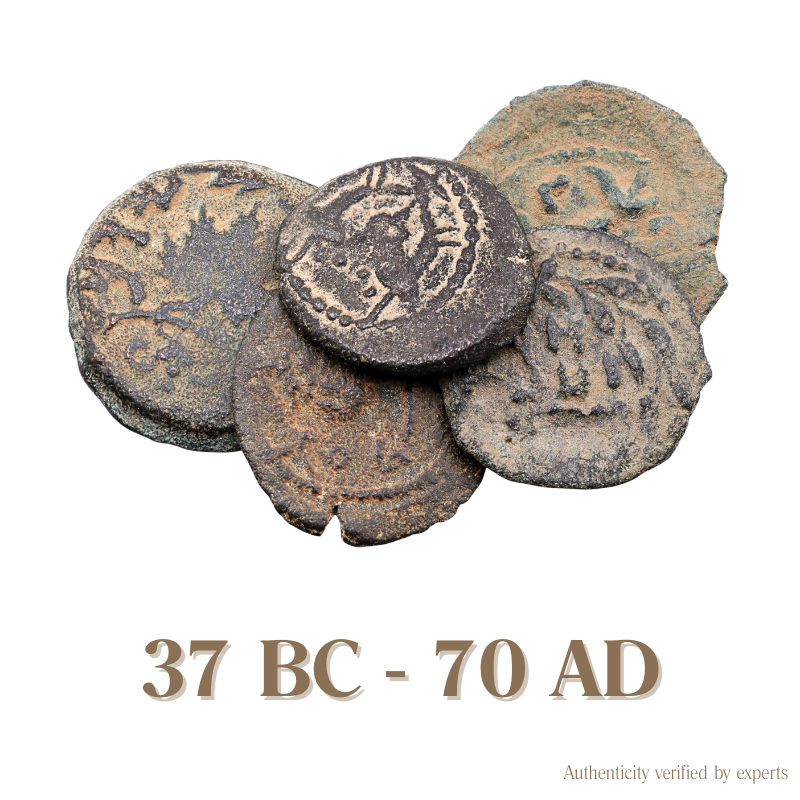Struck in Jerusalem during one of the most charged periods in Judean history, these bronze coins moved through daily life under Herod the Great and into the years of revolt.