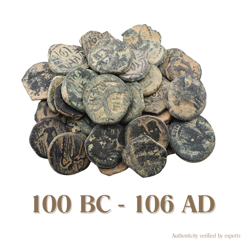 You receive 1 authentic Nabataean bronze coin, randomly picked from a mixed pile like the one pictured.