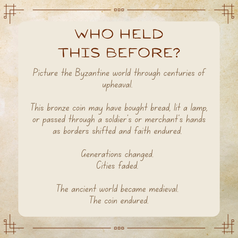 This coin lived through upheaval, resilience, and survival. Hands shaped by belief, hardship, and routine carried it forward while the ancient world slowly became medieval.