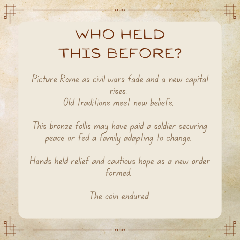 This bronze follis once mattered in daily life. It may have paid a soldier securing the peace after years of conflict. It could have bought bread for a family adjusting to new laws and shifting power.