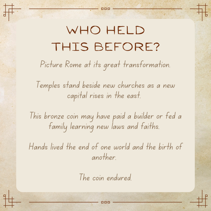 This bronze coin once mattered in that moment of change. It may have paid a worker building Constantinople’s streets and walls. It could have bought food for a family learning to live under new laws and beliefs. Perhaps a merchant accepted it while watching the center of the empire shift east.