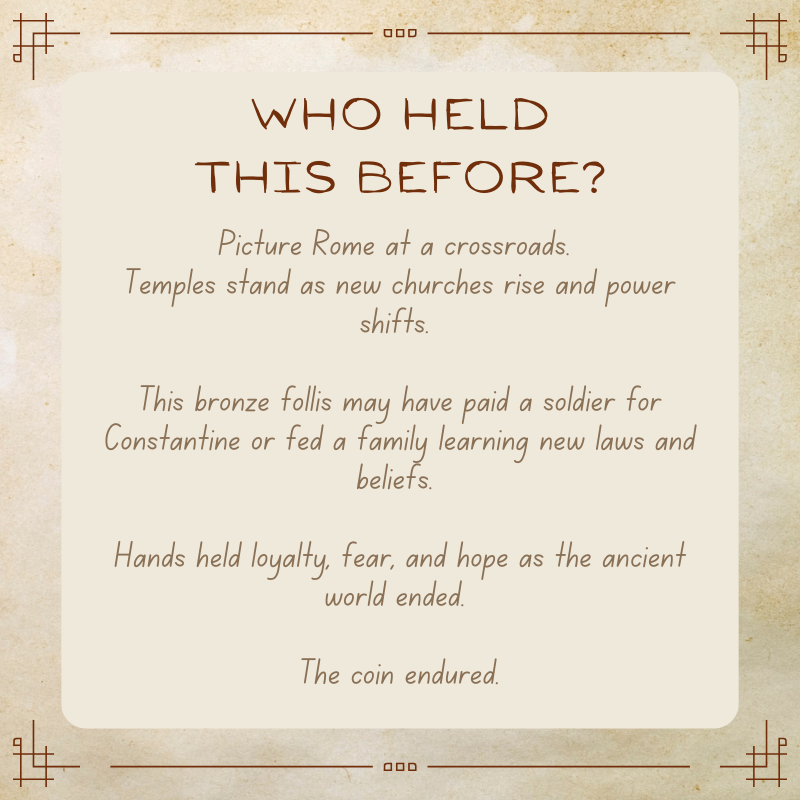 Constantine the Great ruled as Rome transformed itself. This coin passed through hands shaped by loyalty, fear, and hope. People who lived through the end of the