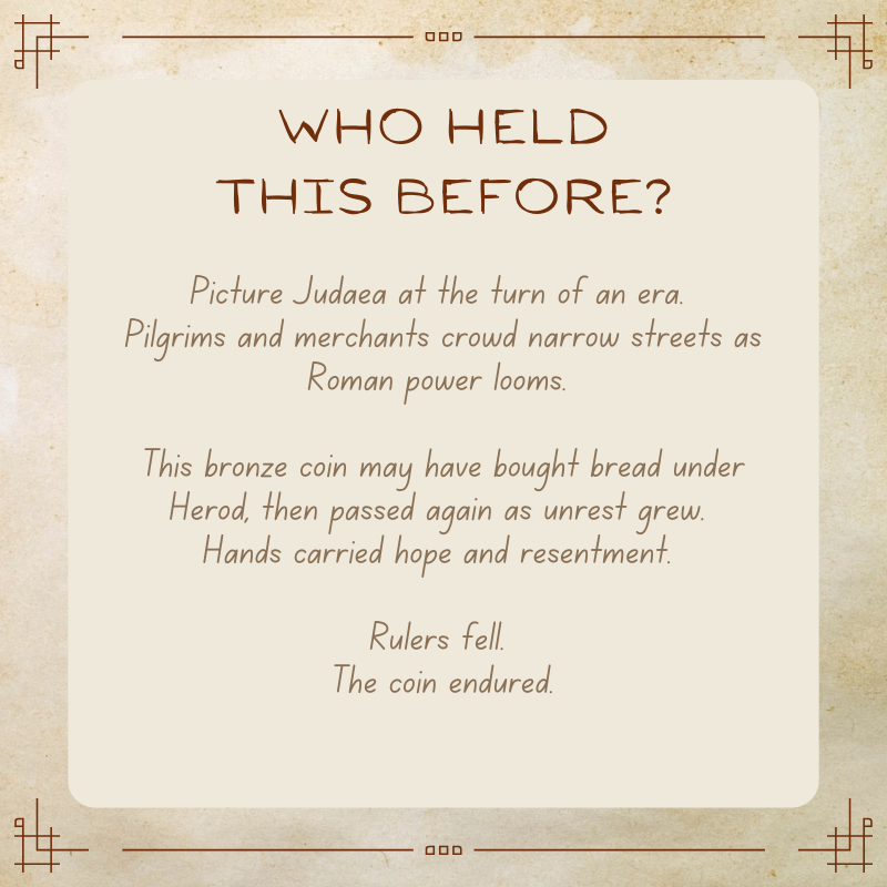 This small bronze coin once carried real weight. It may have bought bread during the reign of Herod the Great, passed across a market stall beneath wary eyes. Years later, it could have circulated under Herod Archelaus, when unrest grew and trust in rulers thinned. Perhaps a family spent it quietly, trying to live between heavy taxes, faith, and fear of what came next.