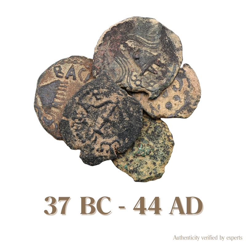 Struck in Jerusalem under the Herodian kings, these bronze coins moved through daily life in ancient Judaea during a time of power, faith, and tension.