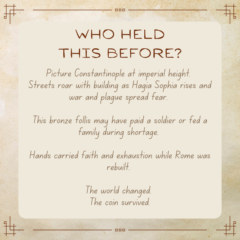 This bronze follis once mattered deeply. It may have paid a soldier guarding the walls or bought bread and oil for a family during shortages. Perhaps a merchant weighed it carefully as the plague crept closer, turning ordinary trade into risk.