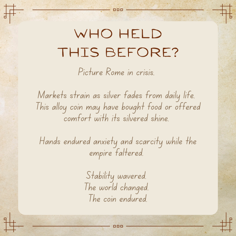 Struck in a low silver alloy, these coins balanced appearance with economic reality as Rome struggled with inflation and instability.